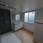 Pour ce qui est de la suite parentale, la salle de bain a été déplacée dans l’ancienne chambre afin d’avoir un espace cohérent, fonctionnel et pertinent.