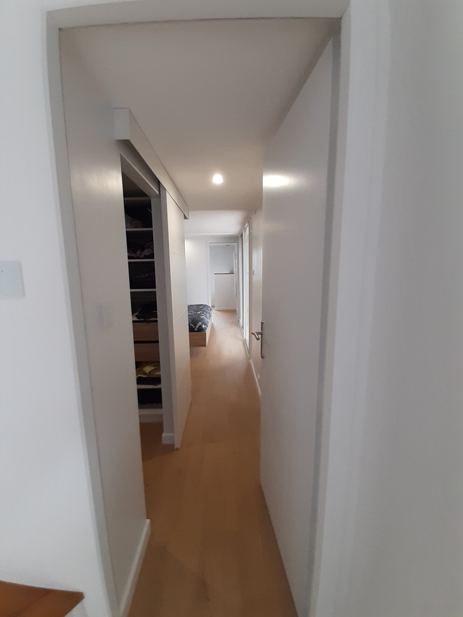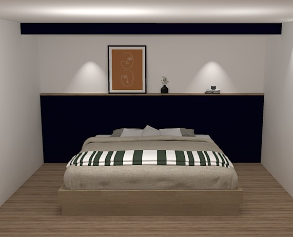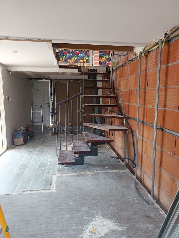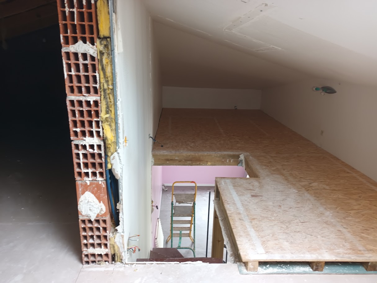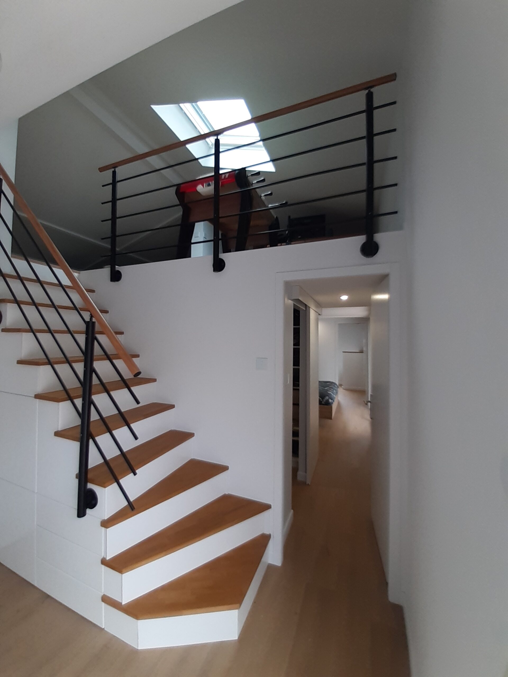 Sur ce projet, mes clients souhaitaient revoir l’agencement de leur suite parentale qui n’en était pas vraiment une puisque l’escalier qui permettait d’accéder à l’étage était entre la salle de bain et la chambre. Nous avons donc tout déposé (salle de bain/escalier) pour tout remettre dans le “bon ordre”. Pour cela, il a fallu boucher la trémie pour en ouvrir une autre et ainsi créer un autre accès à l’étage. Une partie de l’étage était déjà aménagée, nous avons ouvert les cloisons restantes pour accéder au reste des combles et ainsi créer un grand plateau bureau/salle de jeu/chambre d’amis/rangements…à l’étage.